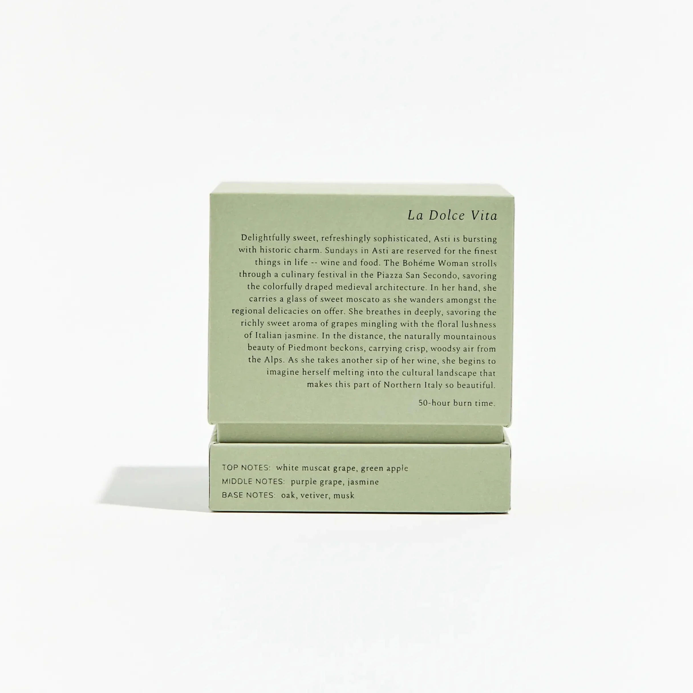 Delightfully sweet, refreshingly sophisticated, Asti is bursting with historic charm. Sundays in Asti are reserved for the finest things in life -- wine and food. The Bohéme Woman strolls through a culinary festival in the Piazza San Secondo, savoring the colorfully draped medieval architecture. In her hand, she carries a glass of sweet Moscato as she wanders amongst the regional delicacies on offer. She breathes in deeply, savoring the richly sweet aroma of grapes mingling with the floral lushness of Italian jasmine. In the distance, the natural mountainous beauty of Piedmont beckons, carrying crisp, woodsy air from the Alps. As she takes another sip of her wine, she begins to imagine herself melting into the cultural landscape that makes this part of Northern Italy so beautiful. 100% all-natural vegan wax, 50-hour burn time, 8.5oz / 240g